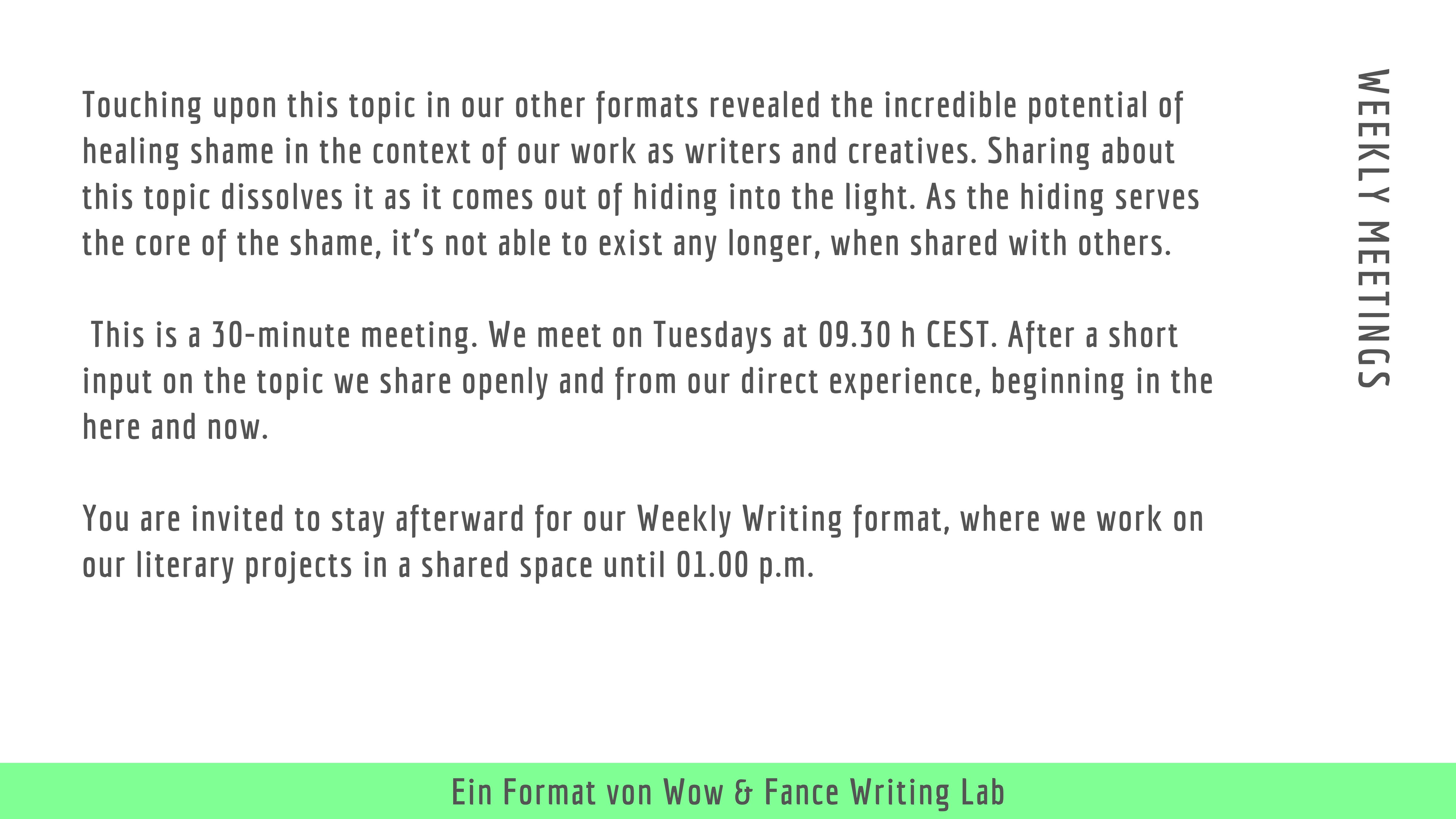 WOW & FANCE offers classes and workshops that focus on a somatic and mindful approach to writing as well as the holistic creational process itself. Our aim is to support writers and other creatives to find the expression that feels genuine to them as we believe that this is the entry point for valuable and responsible contributions to the world.